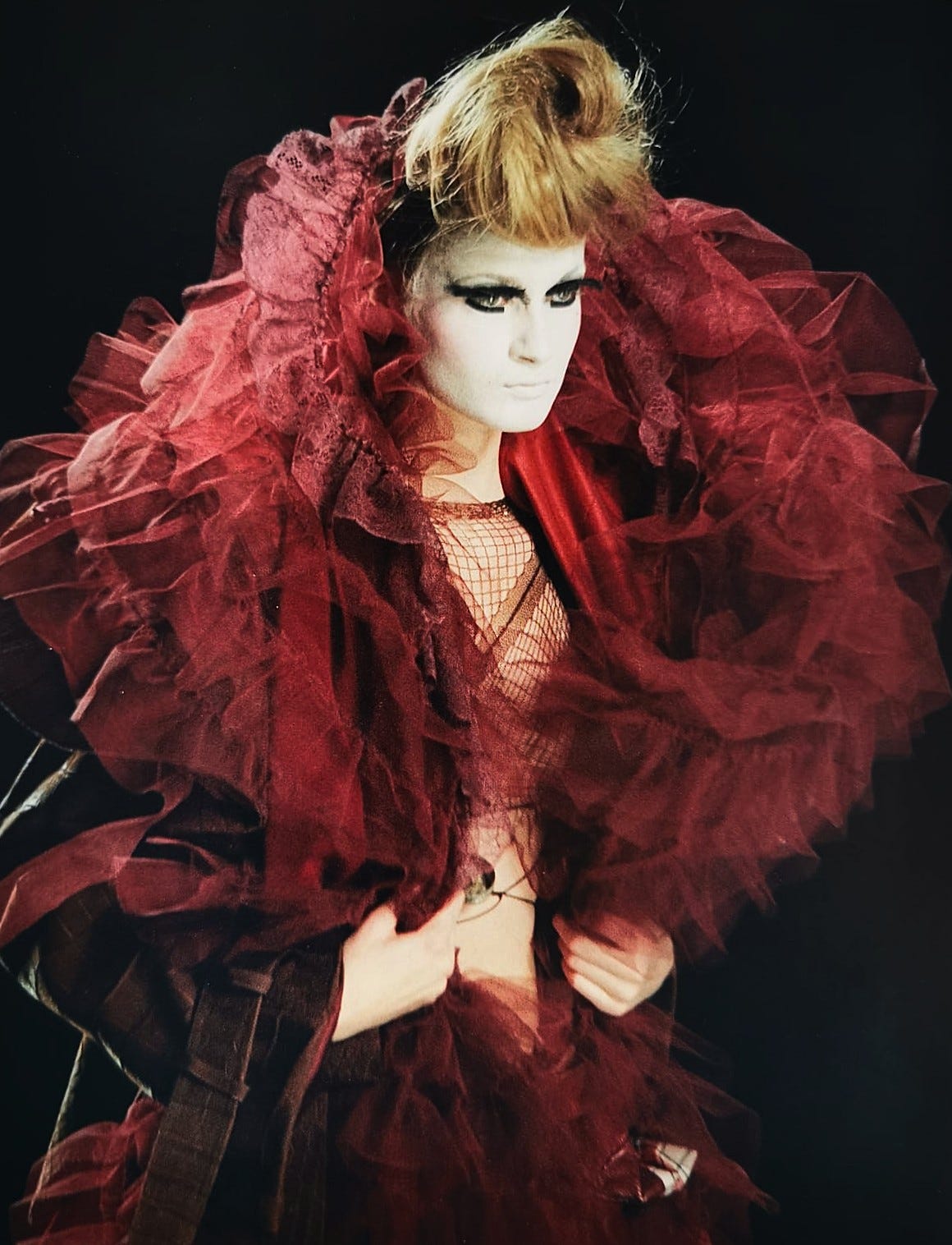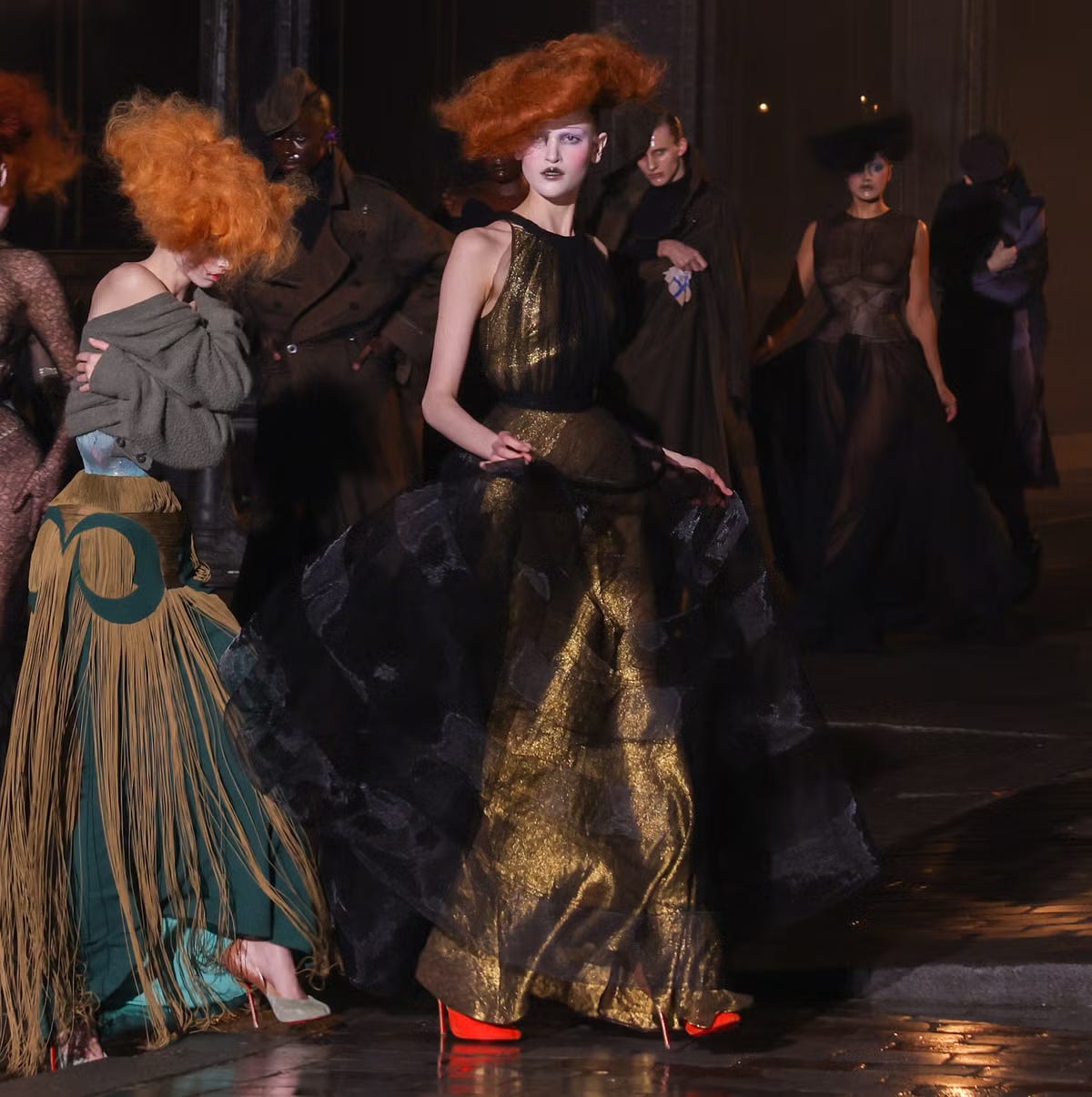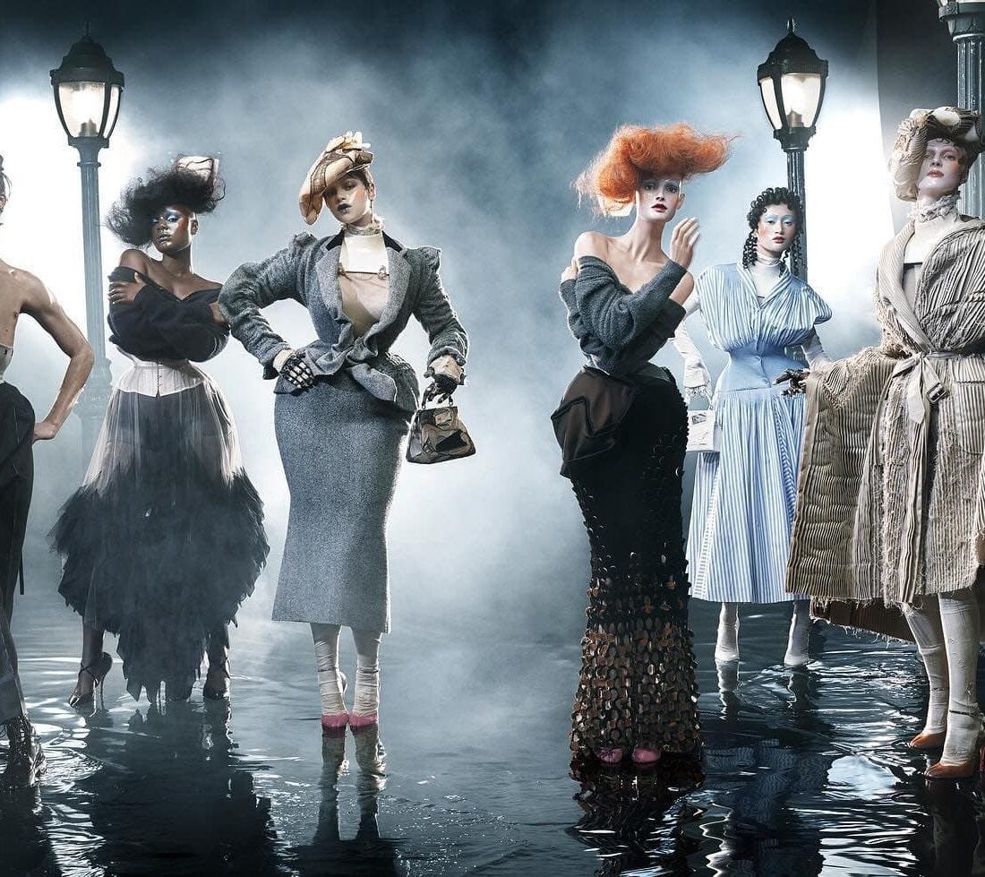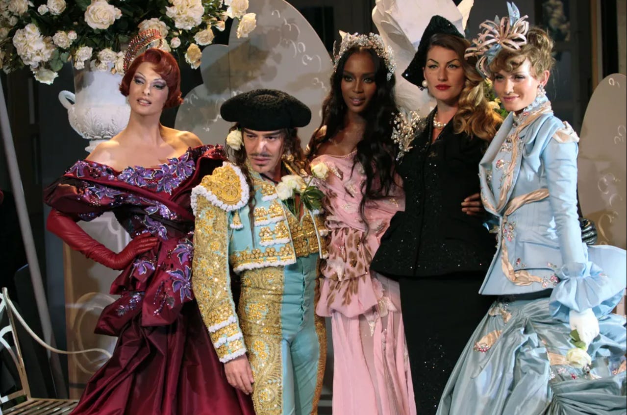 Galliano s-a retras de la direcția artistică a brandului Margiela semnând o colecție fabuloasă, couture, în 2024, ca un fel de cântec de lebădă, poate. Nu se știe ce va face în continuare.