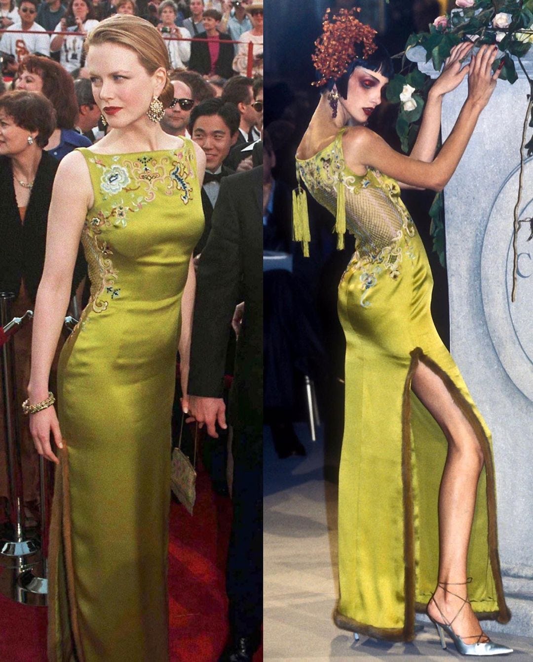 Multe dintre creațiile Galliano au rămas memorabile și prin purtarea lor pe covorul roșu. Una dintre ele purtată de Nicole Kidman la decernarea premiilor Oscar în 1997, rochia verde chartreuse bordată cu blană și brodată cu motive exotice chinezești a făcut furori în momentul apariției sale pe actriță fiind reprodusa mai mult sau mai puțin jalnic în sute de mii de exemplare.