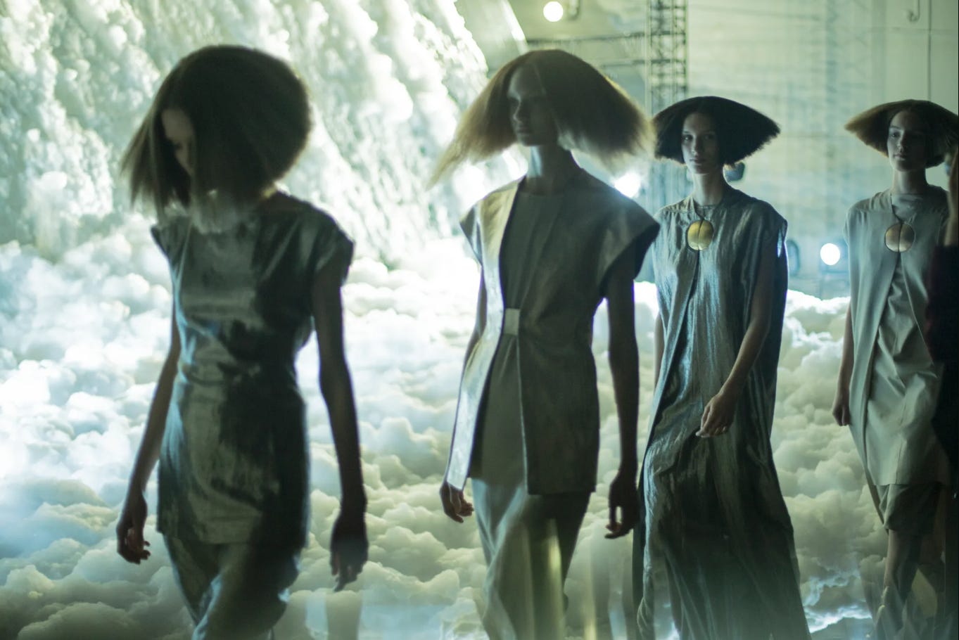Plasată într-un spațiu proaspăt restaurat, foarte cutting edge, cu spoturi de lumină direcționate strict pe creațiile prețioase și restul aflat în întuneric, cu un aspect căutat dramatic a funcționat ca un fel de presentiment cumva a ceea ce avea să se întâmple în septembrie.